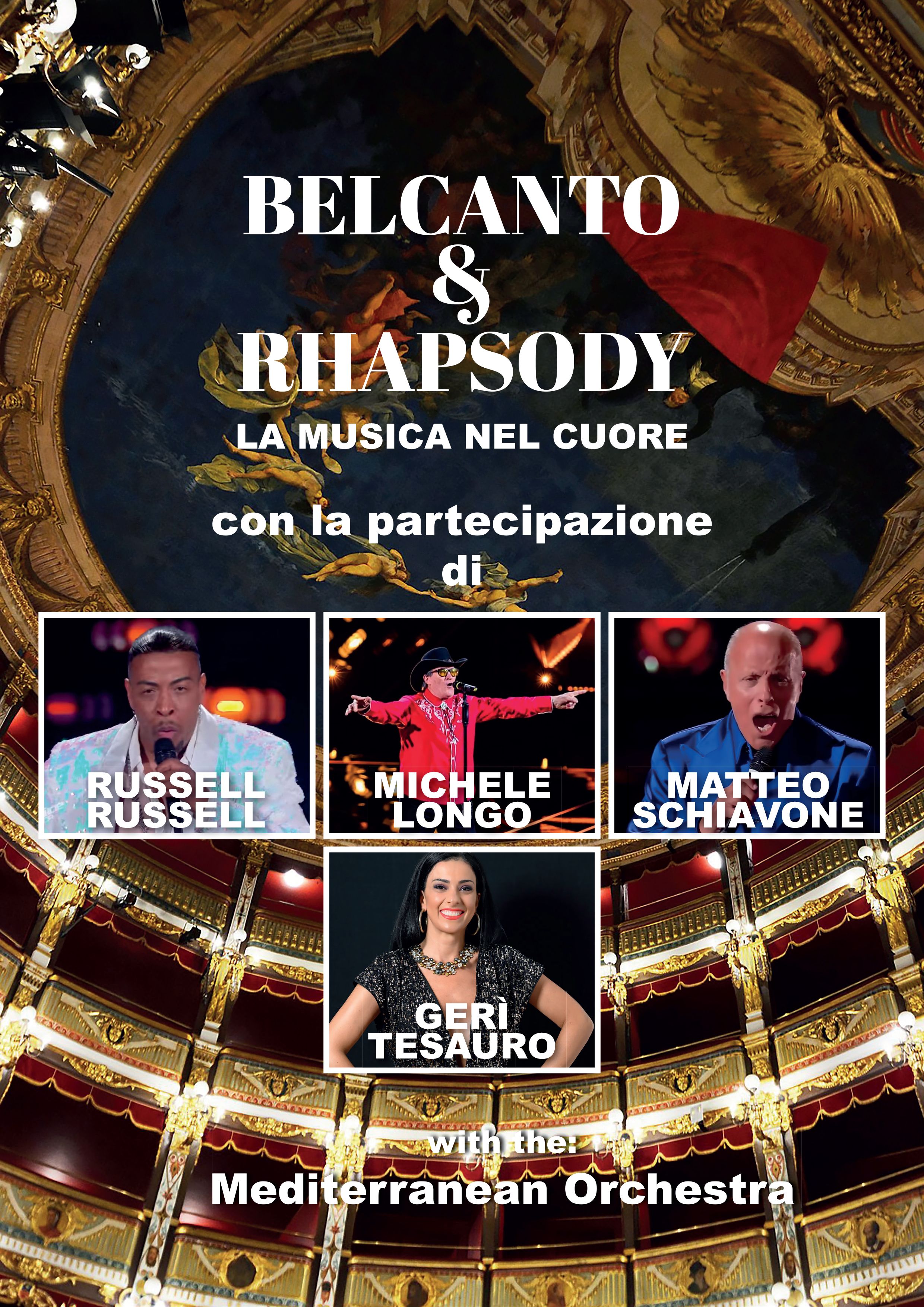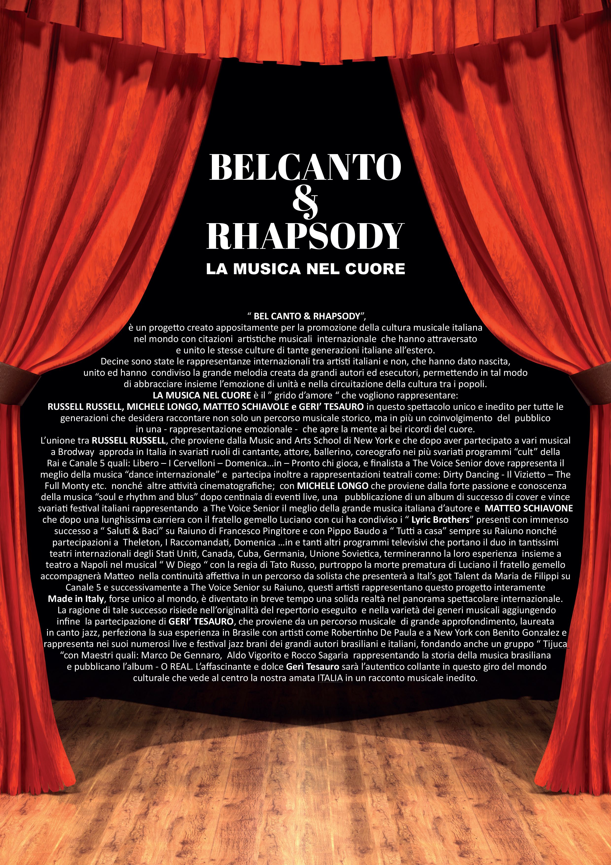 “ BEL CANTO & RHAPSODY”, è un progetto creato appositamente per la promozione della cultura musicale italiana nel mondo con citazioni artistiche musicali internazionale che hanno attraversato e unito le stesse culture di tante generazioni italiane all’estero. Decine sono state le rappresentanze internazionali tra artisti italiani e non, che hanno dato nascita, unito ed hanno condiviso la grande melodia creata da grandi autori ed esecutori, permettendo in tal modo di abbracciare insieme l’emozione di unità e nella circuitazione della cultura tra i popoli. LA MUSICA NEL CUORE è il ” grido d’amore “ che vogliono rappresentare: RUSSELL RUSSELL, MICHELE LONGO, MATTEO SCHIAVONE e GERI’ TESAURO in questo spettacolo unico e inedito per tutte le generazioni che desidera raccontare non solo un percorso musicale storico, ma in più un coinvolgimento del pubblico in una – rappresentazione emozionale – che apre la mente ai bei ricordi del cuore. L’unione tra RUSSELL RUSSELL, che proviene dalla Music and Arts School di New York e che dopo aver partecipato a vari musical a Brodway approda in Italia in svariati ruoli di cantante, attore, ballerino, coreografo nei più svariati programmi “cult” della Rai e Canale 5 quali: Libero – I Cervelloni – Domenica…in – Pronto chi gioca, e finalista a The Voice Senior dove rappresenta il meglio della musica “dance internazionale” e partecipa inoltre a rappresentazioni teatrali come: Dirty Dancing – Il Vizietto – The Full Monty etc. nonché altre attività cinematografiche; con MICHELE LONGO che proviene dalla forte passione e conoscenza della musica “soul e rhythm and blus” dopo centinaia di eventi live, una pubblicazione di un album di successo di cover e vince svariati festival italiani rappresentando a The Voice Senior il meglio della grande musica italiana d’autore e MATTEO SCHIAVONE che dopo una lunghissima carriera con il fratello gemello Luciano con cui ha condiviso i “ Lyric Brothers” presenti con immenso successo a “ Saluti & Baci” su Raiuno di Francesco Pingitore e con Pippo Baudo a “ Tutti a casa” sempre su Raiuno nonché partecipazioni a Theleton, I Raccomandati, Domenica …in e tanti altri programmi televisivi che portano il duo in tantissimi teatri internazionali degli Stati Uniti, Canada, Cuba, Germania, Unione Sovietica, termineranno la loro esperienza insieme a teatro a Napoli nel musical “ W Diego “ con la regia di Tato Russo, purtroppo la morte prematura di Luciano il fratello gemello accompagnerà Matteo nella continuità affettiva in un percorso da solista che presenterà a Ital’s got Talent da Maria de Filippi su Canale 5 e successivamente a The Voice Senior su Raiuno, questi artisti rappresentano questo progetto interamente Made in Italy, forse unico al mondo, è diventato in breve tempo una solida realtà nel panorama spettacolare internazionale. La ragione di tale successo risiede nell’originalità del repertorio eseguito e nella varietà dei generi musicali aggiungendo infine la partecipazione di GERI’ TESAURO, che proviene da un percorso musicale di grande approfondimento, laureata in canto jazz, perfeziona la sua esperienza in Brasile con artisti come Robertinho De Paula e a New York con Benito Gonzalez e rappresenta nei suoi numerosi live e festival jazz brani dei grandi autori brasiliani e italiani, fondando anche un gruppo “ Tijuca “con Maestri quali: Marco De Gennaro, Aldo Vigorito e Rocco Sagaria rappresentando la storia della musica brasiliana e pubblicano l’album – O REAL. L’affascinante e dolce Gerì Tesauro sarà l’autentico collante in questo giro del mondo culturale che vede al centro la nostra amata ITALIA in un racconto musicale inedito.